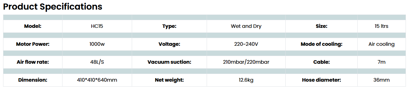 HC 15  is a wet & dry Vacuum cleaner, stainless steel container capacity of 15 liters, 1000-watt powerful motor, and it has powerful suction